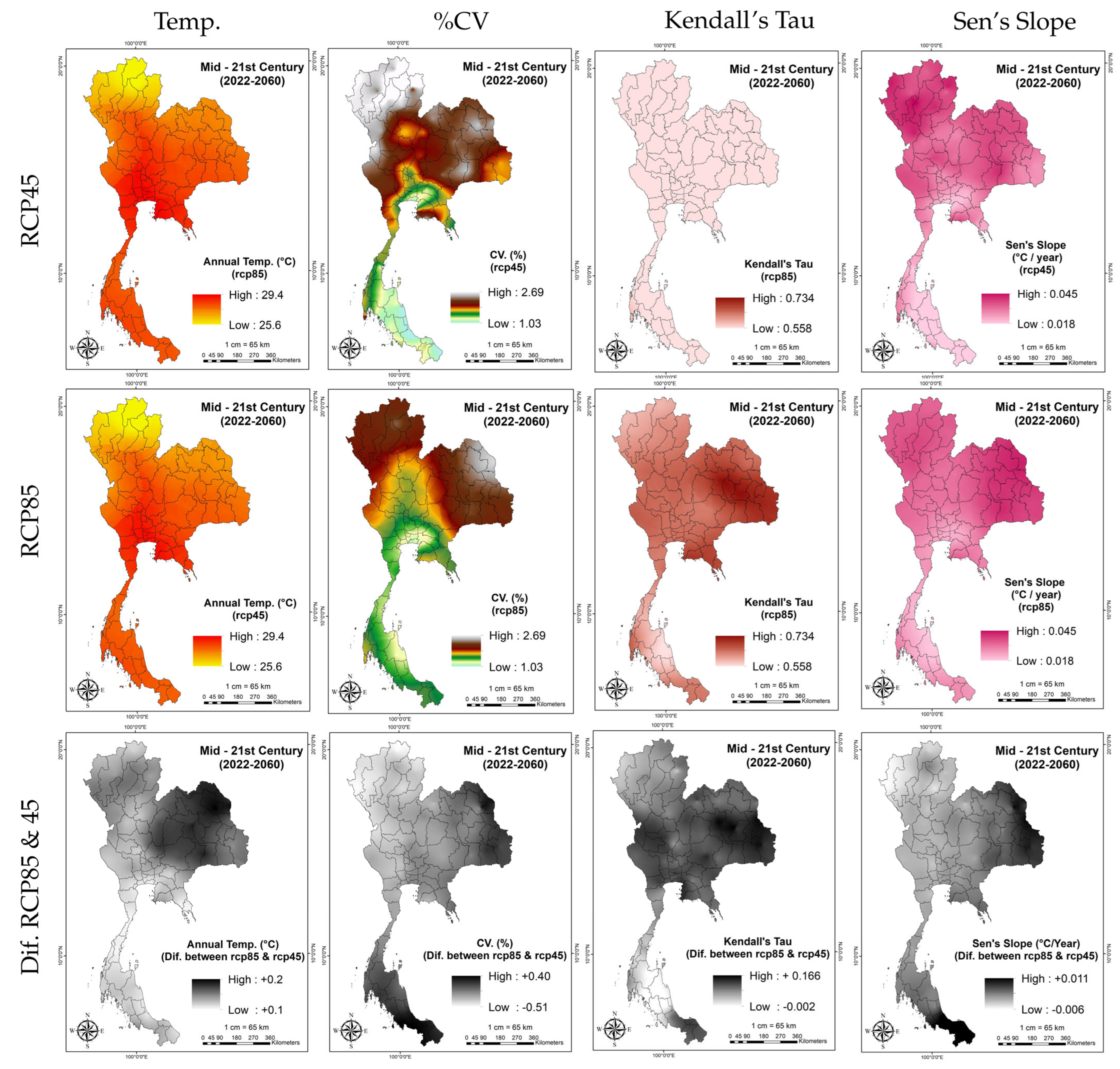 Table 10. Annual %CV patterns for RCP4.5 and RCP8.5 were similar, ranging from 12.58% to 29.09% (mean 12.5%) and 12.41% to 31.21% (mean 12.9%), respectively. High %CV values were frequent in the eastern and southern regions near the Gulf of Thailand and Andaman Sea, due to unstable southwest and northeast monsoons causing inter-annual rainfall variability [