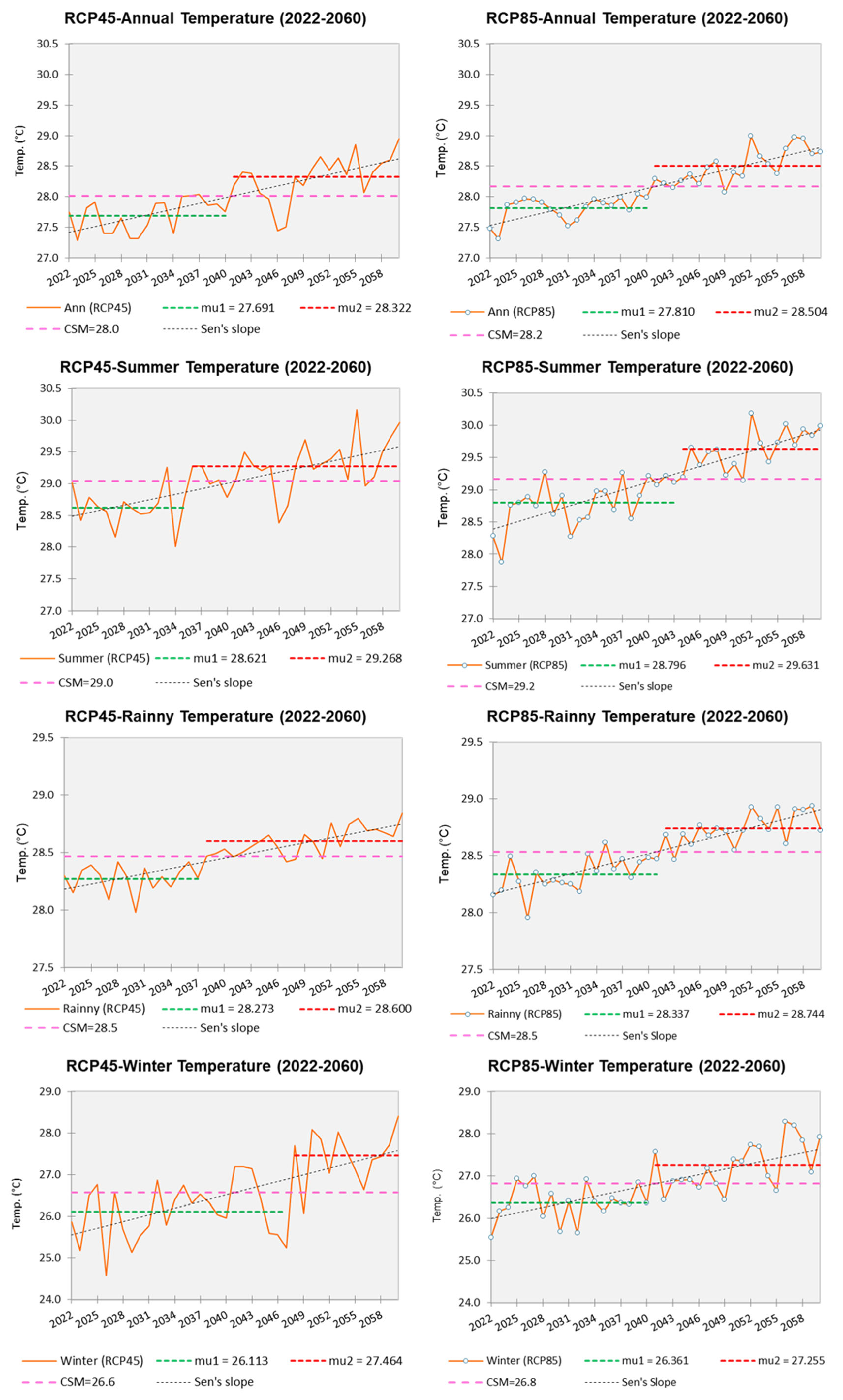 Figure 4, were approximately 28.0 °C and 28.2 °C for RCP4.5 and RCP8.5, respectively. Seasonally, the CSM values were ~29.0 °C (summer), 28.5 °C (rainy), and 26.6 °C (winter) for RCP4.5, and 29.2 °C, 28.5 °C, and 26.8 °C for RCP8.5.