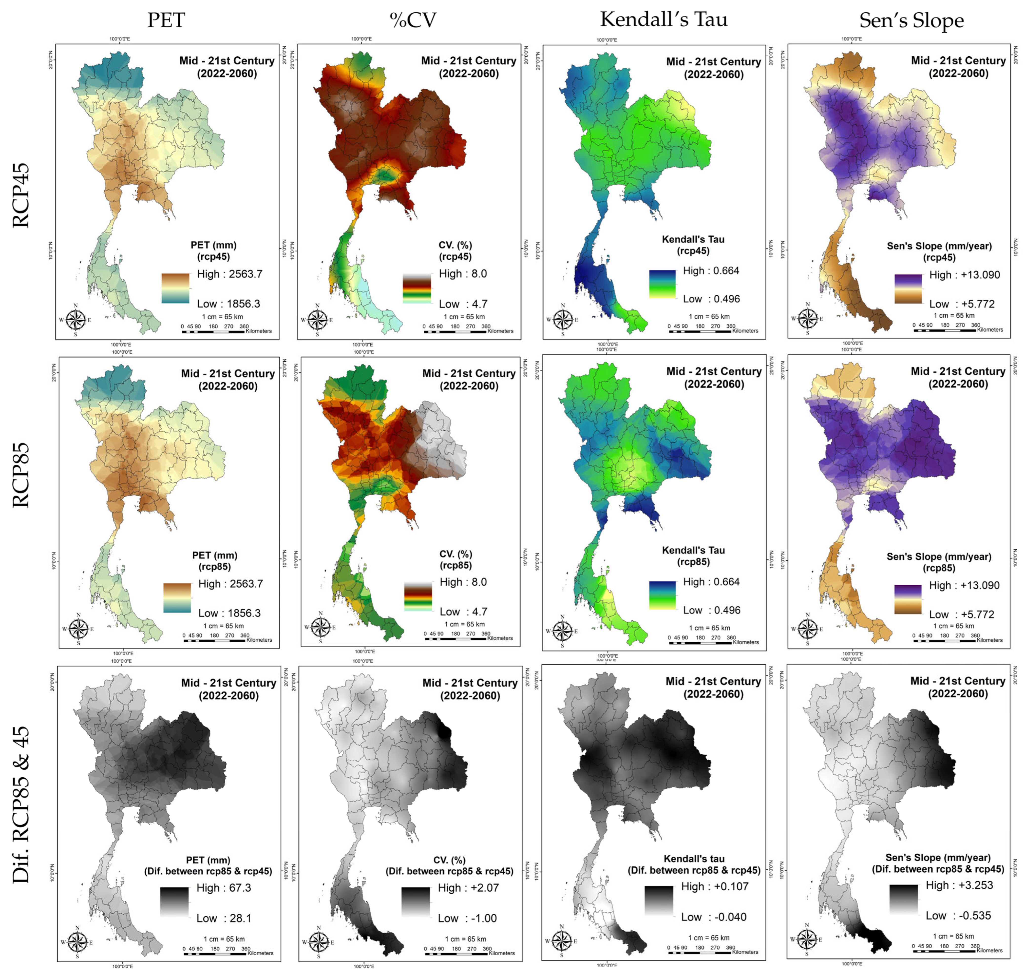 Figure 7) were similar between scenarios, though drier areas were more extensive under RCP8.5, especially in the northeast and central regions near Bangkok, with lowest PET in the north, which is consistent with the temperature distribution. Cumulative seasonal means (CSMs) of PET (