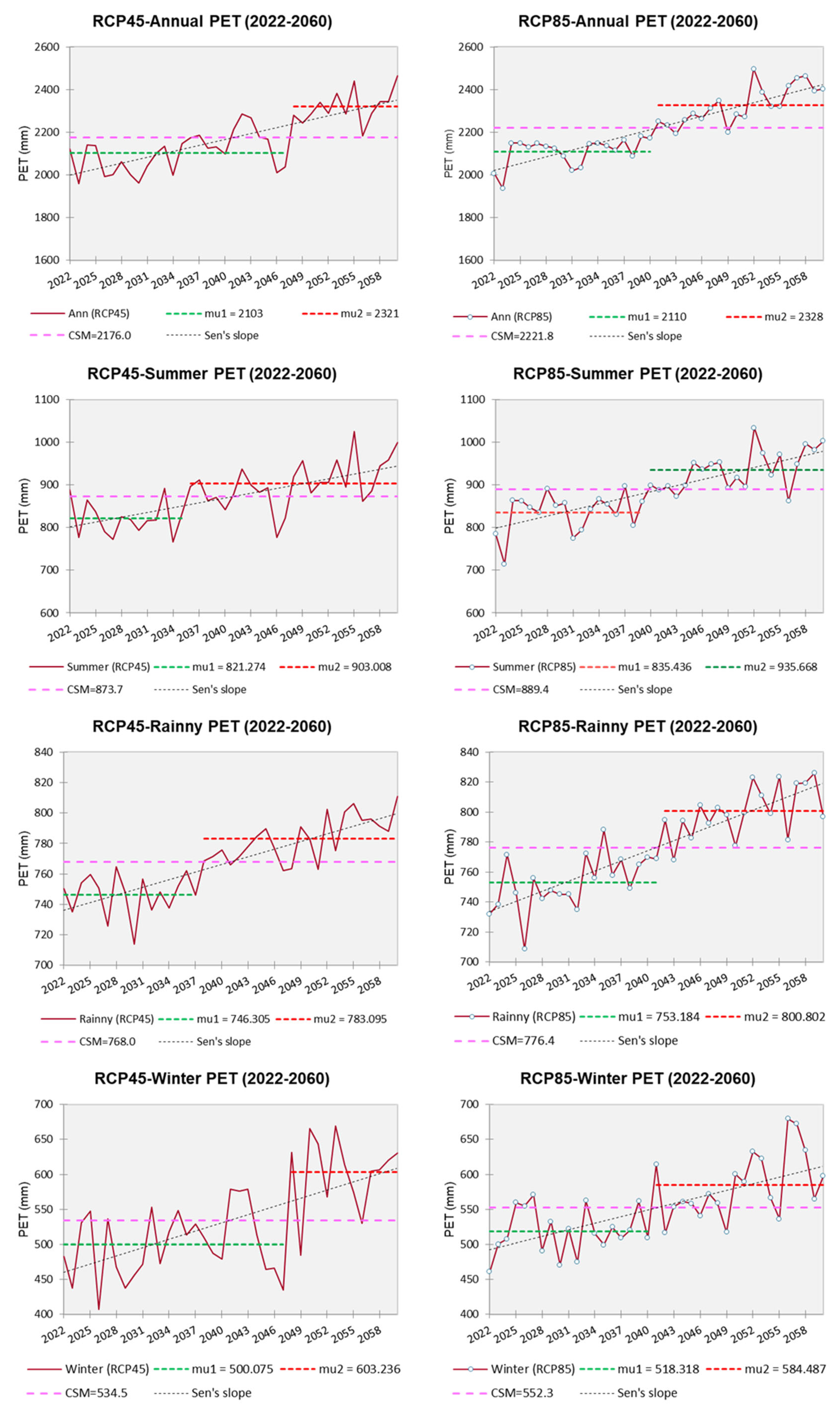 Table 10) are approximately +3.95 mm/year (summer), +1.69 (rainy), +3.85 (winter), and +9.93 (annual) for RCP4.5, and +4.63, +2.33, +3.14, and +10.36 mm/year for RCP8.5. These suggest PET is influenced more by temperature changes than rainfall.