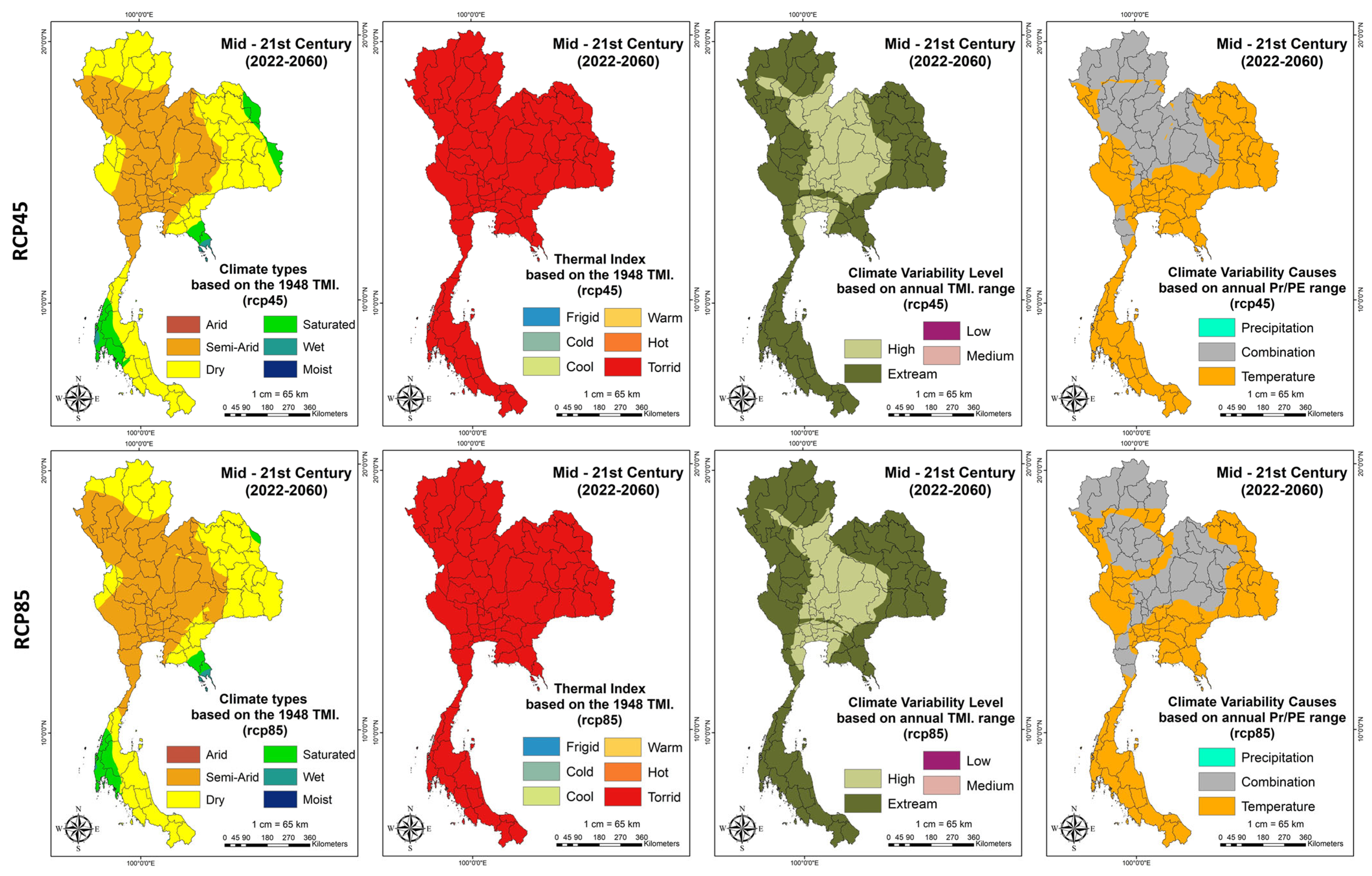 Figure 9 for RCP4.5 (first row, third column) and RCP8.5 (second row, third column). Most of Thailand falls into the extreme variability category, covering about 67.9% (350,778.2 km