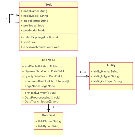 According to the functionality of end nodes, we can summarize two basic classes for end nodes: Ability and DataField. An Ability class is associated with the corresponding equipment, describing the equipment’s functionalities. An end node may contain multiple instances of Ability, such as processing-related abilities and data-related abilities. Each ability determines specific operations, such as reading, writing, and sending data. Each ability has its own inputs and outputs. DataField describes the data types and features that can be generated by the equipment. It is one of the most important elements in intelligent manufacturing. Therefore, before giving the definition of the end metamodel, we have the following definitions.