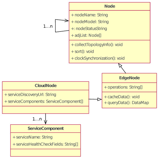 From the design of cloud–edge–end, the data processing operations provided by the cloud also exist in the edge nodes. Hence, we define the Cloud class as an inheritance of the Edge Class. The Cloud node consists of CloudNode and ServiceComponent.