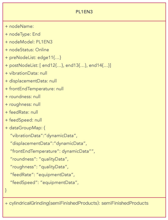 Listing 2 shows the values of other fields in the end model. The metadata for “endeNodeAbilities” indicates that the device PL1EN3 has the ability of cylindrical grinding. It takes a semi-product as input and produces a semi-product for the next process section. The dynamic data during the production process includes vibration signal, displacement signal, and temperature. The quality data contains upper section size and taper size, and the controllable variables of the device are rapid traverse and rough retract amount.