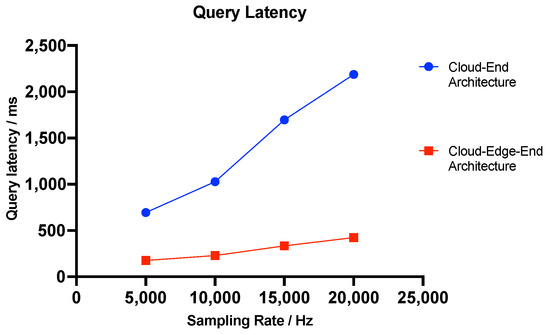 First, we tested the response latency of querying data of the same size. In our test case, we need to query data of the same size in each device separately, and the timing starts from the first query request and ends when the last query request returns. We ensure that all query requests are executed by independent threads, and the test server has enough hardware resources to complete the query requests, which means that the query requests are fully parallelized. First, at a data scale of 5000 Hz sampling rate, we directly request cloud nodes for the cloud-end architecture and query data of a total of 16 devices in 4 production lines. Then, for the cloud–edge–end architecture, we simultaneously query the data in the edge nodes of 4 production lines, measure the latency of the above two scenarios, cycle 10 times, and calculate the average latency. Then, we increased the data sampling rate to 10,000 Hz, 15,000 Hz, and 20,000 Hz. We repeated the above operations to obtain a total of 4 sets of data. The average latency is as shown in Figure 18.
