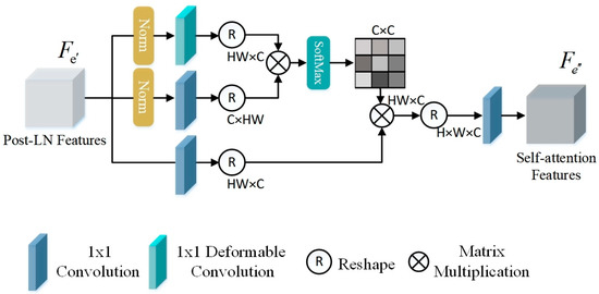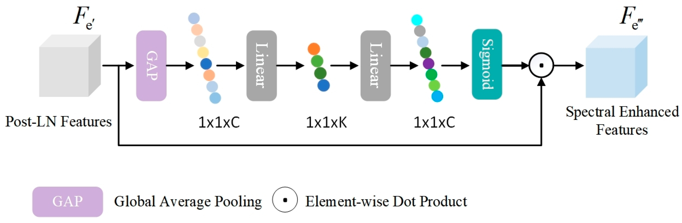 Figure 1b. The EETB module consists of two residual blocks, the first containing a Layer Normalization (LN) layer followed by a deformable convolution-based self-attention layer integrated with a spectral enhancement (SE) module to enhance feature representation capability, and the second comprising a LN layer with a subsequent MLP layer designed to deeply explore non-linear feature relationships. Let