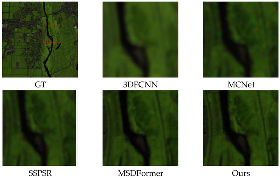 Figure 6). Our ESSTformer addresses this with a decoupled dual-Transformer architecture: a dedicated Spatial Transformer explicitly captures long-range spatial contexts, working synergistically with the Spectral Transformer. This design enables ESSTformer to closely match the ground truth in both spatial sharpness (e.g., crisp river edges) and spectral consistency, outperforming MSDFormer and other methods.