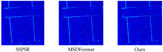 Figure 7), with the GT as the reference. It is evident that 3DFCNN, MCNet, and SSPSR exhibit prominent error regions (brighter areas), indicating significant deviations in edge and texture reconstruction. MSDFormer reduces errors to some extent but still has noticeable residual errors. In contrast, ESSTFormer shows the darkest error map, meaning it has the smallest deviation from GT, directly demonstrating its superiority in spatial detail restoration and reconstruction fidelity. Such performance gain originates from our decoupled spatial spectral Transformer architecture and gated convolution module, which enable a more precise modeling of spatial textures in hyperspectral images.