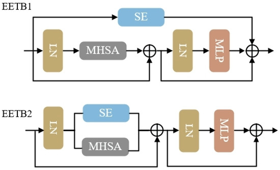 To determine the optimal position of the SE module within the EETB framework, we tested two variants, named EETB1 and EETB2, respectively. EETB1 places the SE module outside the EETB, while EETB2 embeds the SE module into the self-attention computation, as shown in