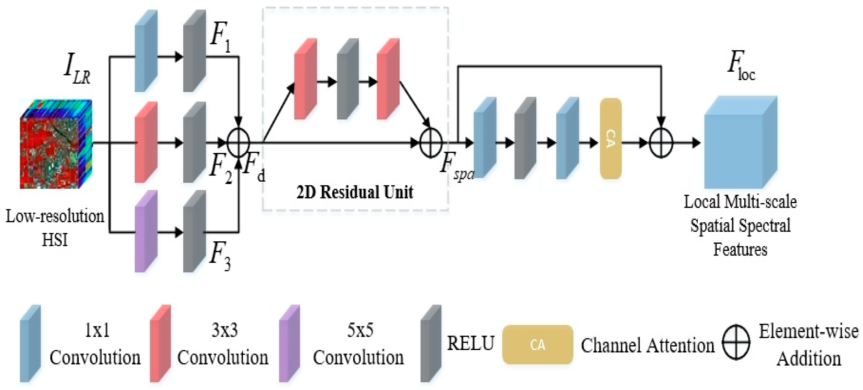 While existing methods often rely on convolutional kernels of fixed receptive fields, their capacity to represent multi-scale spatial spectral contexts remains limited. Accordingly, we design the MSAM, aimed at explicitly capturing local features at multiple scales. The module takes