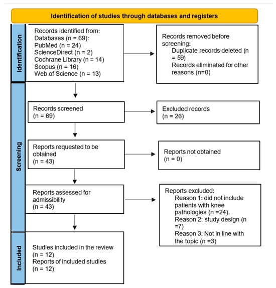 The literature search was conducted in January 2025. Articles written in both English and Spanish from the following databases were included: Medline (PubMed), Scopus, Web of Science, Cochrane Library and Science Direct. Duplicate articles were excluded using the Zotero bibliographic manager. Search strategies were based on the eligibility criteria described above. Medical Subject Headings (MESH), keywords and Boolean operators were used to refine the search: “blood flow—restricted”, “knee,” “physical therapy”, “physiotherapy,” “rehabilitation”, grouped in the following search equation: (Blood Flow—restricted) AND ((Physical therapy) OR (physiotherapy) OR (Rehabilitation)) AND (Knee).
