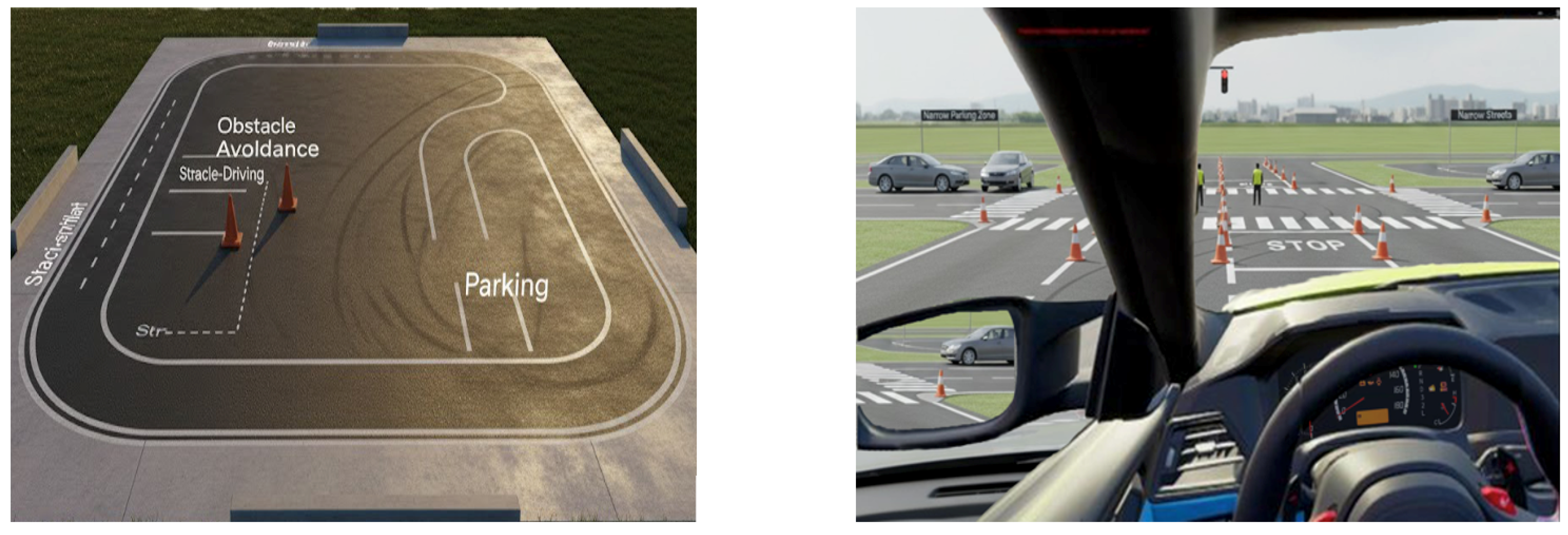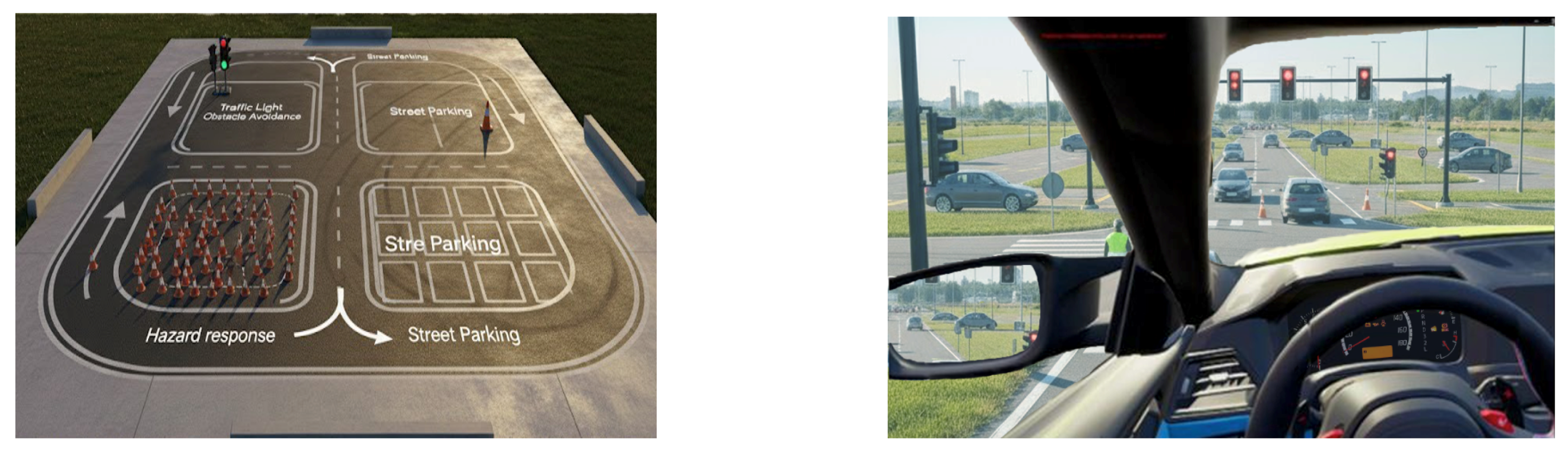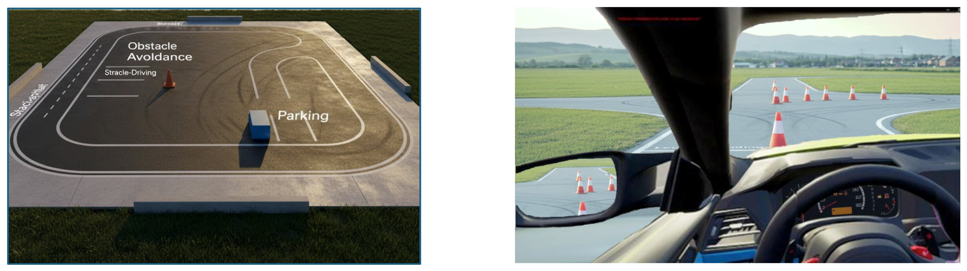 - Introduce unexpected obstacles (e.g., moving cones or pedestrian dummies) for reaction training.