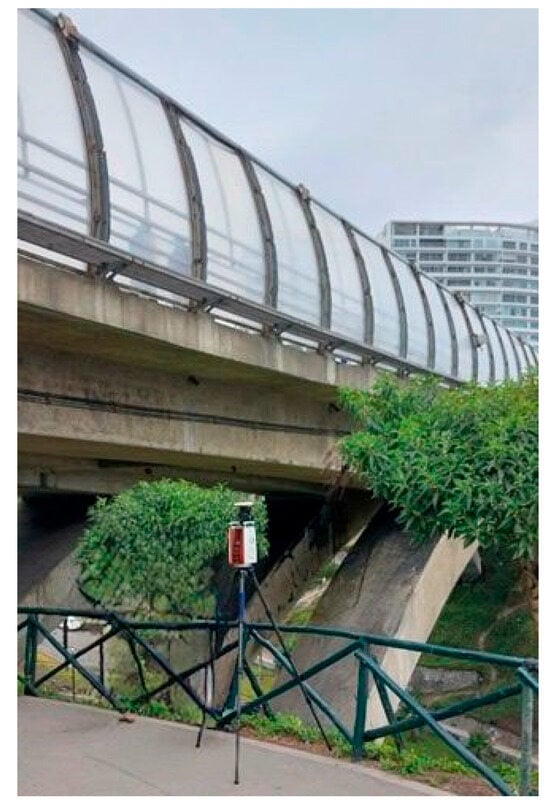 Terrestrial Laser Scanning (TLS) is used to capture precise data of the entire structure. During this phase(Figure 3), the devices generate a three-dimensional point cloud, allowing for detailed recording of the bridge’s geometry and current conditions. Subsequently, the collected data is processed using specialized software tools such as RECAP PRO (2025.1.2. hotfix), resulting in 3D models integrated with images. These 3D models serve as the foundation for developing a digital twin of the bridge, which replicates its physical state, structural studies, and continuous monitoring. The integration of this information into the digital twin enables comprehensive evaluations of structural performance and the high-precision detection of potential failures or anomalies in the bridge.