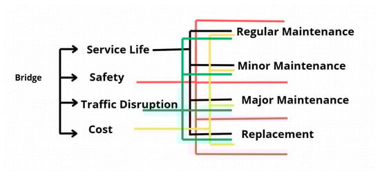 To evaluate remediation strategies for the Villena Rey Bridge, the main intervention alternatives were analyzed considering structural safety, the bridge’s service life, and traffic impact. This procedure was based on a set of defined criteria aimed at minimizing costs and optimizing the functionality of the structure. The strategies were assessed using the pairwise comparison method, applying Saaty’s nine-point scale of relative importance. Accordingly, a comparison matrix was constructed to identify the priority criteria for the bridge’s rehabilitation. In the case of the Villena Rey Bridge, safety was determined to be the most relevant factor, surpassing other elements such as structural lifespan or maintenance cost. Furthermore, the prioritization of these criteria was represented through a hierarchical structure, facilitating the assignment of specific weights to each involved factor (Table 4). The validation of the analysis yielded a Consistency Index (CI) of 0.0043, indicating that the decisions made during the process were coherent. Based on this evaluation, the most effective alternatives were defined for each type of structural element, enabling optimization of the bridge’s maintenance and rehabilitation (Figure 5).