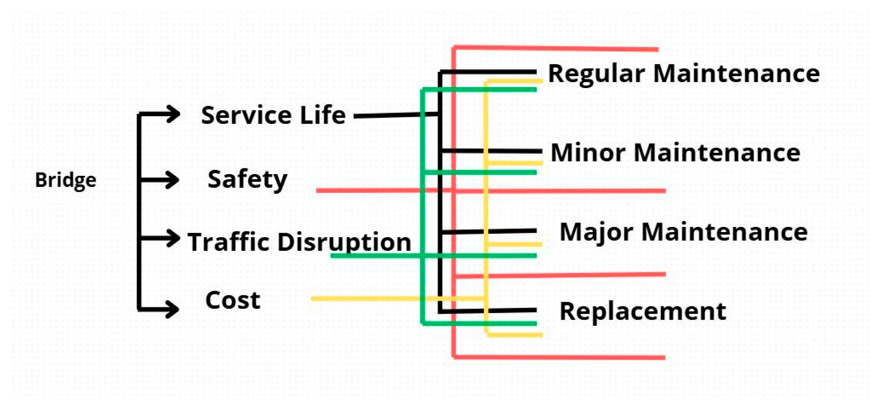 - Wei, J.; Chen, G.; Huang, J.; Shou, W.; Wang, J. Resource-constrained bridge maintenance optimization by harmonizing structural safety and maintenance duration. Eng. Struct. 2024, 308, 118024. [Google Scholar] [CrossRef]