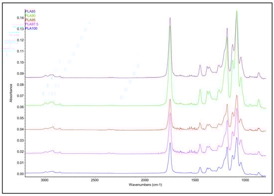 ATR FT-IR stacked spectra of the PLA-based filaments.