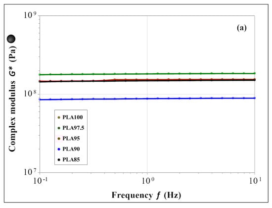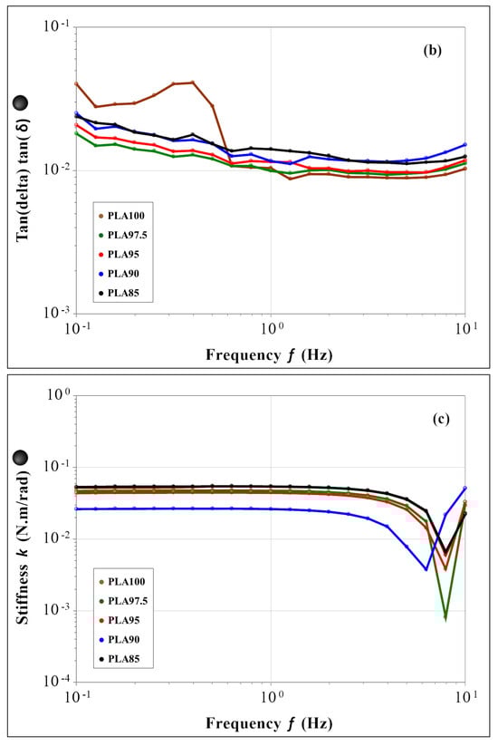 Frequency sweep results within the LVR for the (a) complex modulus, (b) tan δ and (c) stiffness; for PLA85 in black, PLA90 in blue, PLA95 in red, PLA 97.5 in green and PLA100 in brown.
