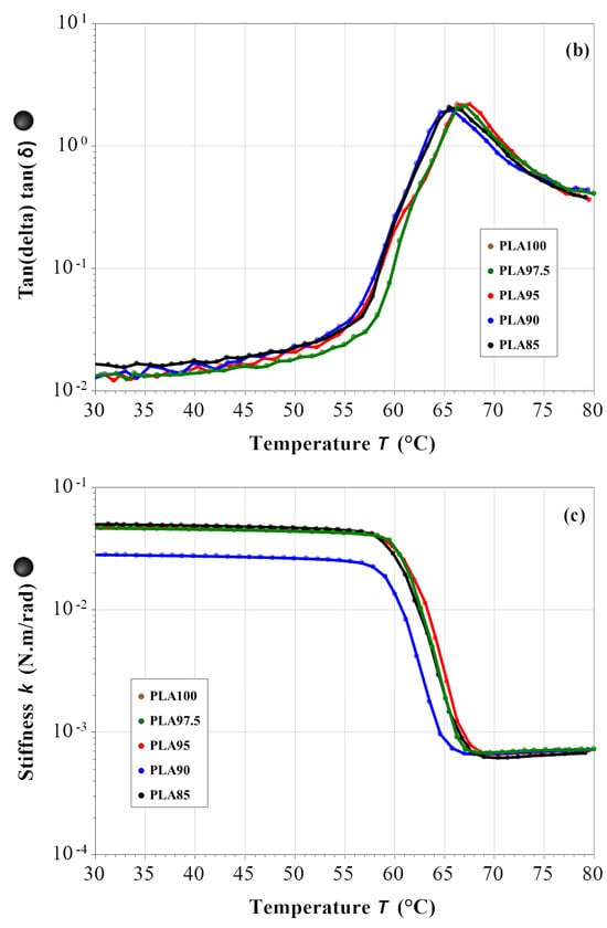 Temperature sweep results for the (a) complex modulus, (b) tan δ and (c) stiffness; for PLA85 in black, PLA90 in blue, PLA95 in red, PLA 97.5 in green and PLA100 in brown.