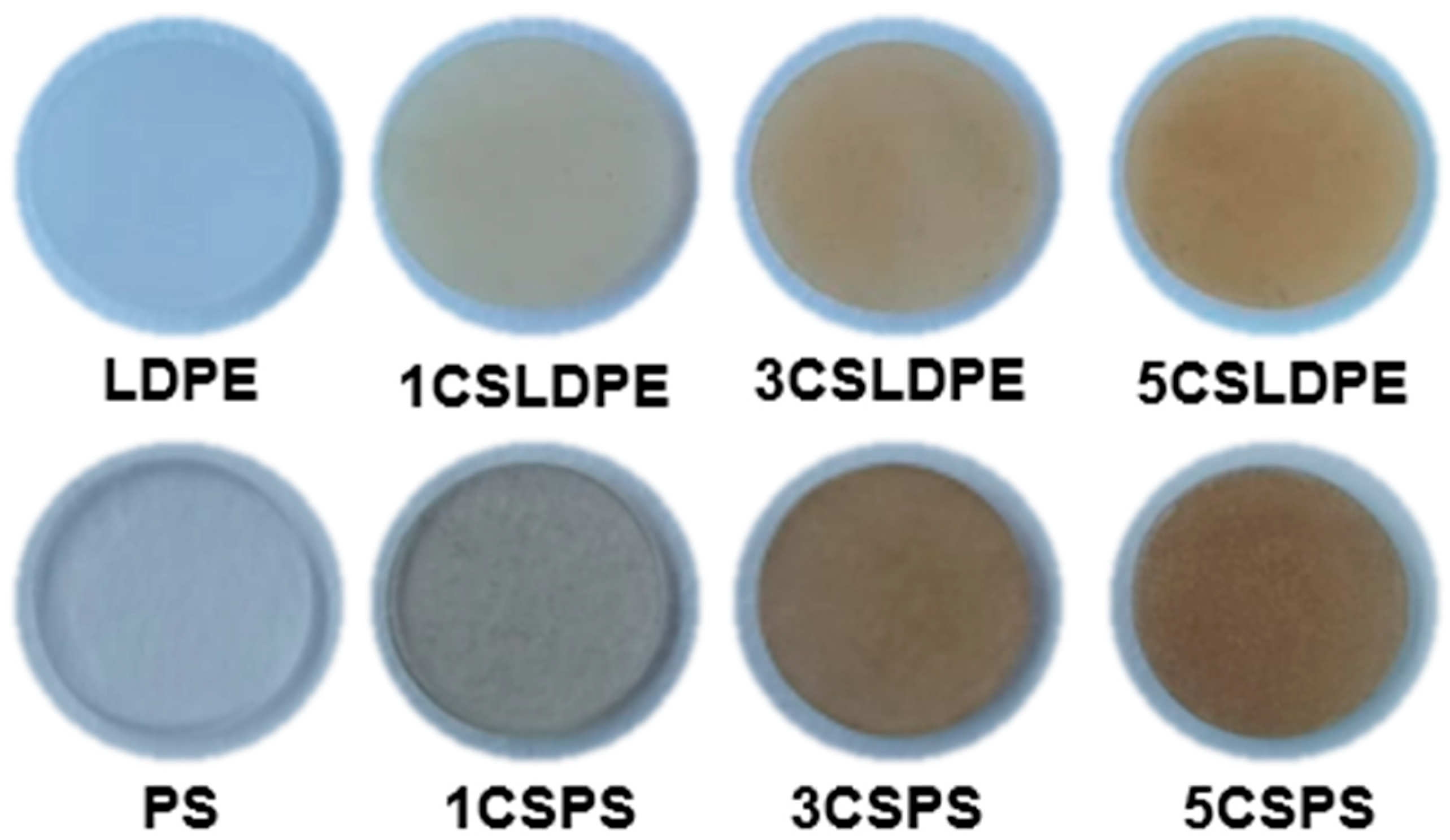 - Kusumastuti, Y.; Putri, N.R.E.; Timotius, D.; Syabani, M.W. Effect of chitosan addition on the properties of low-density polyethylene blend as potential bioplastic. Heliyon 2020, 6, e05280. [Google Scholar] [CrossRef] [PubMed]