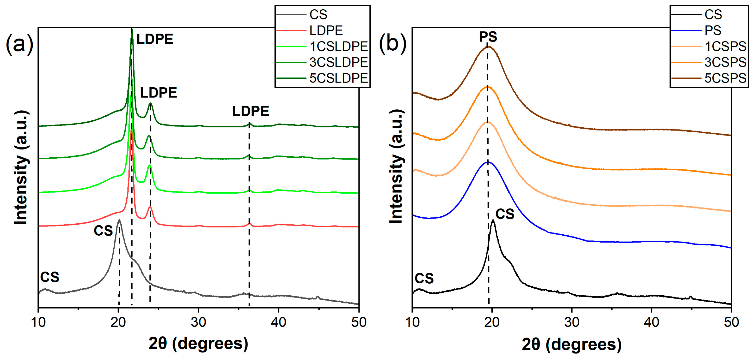 - Popyrina, T.N.; Khavpachev, M.A.; Ivanov, P.L.; Monakhova, K.Z.; Kuchkina, I.O.; Evtushenko, Y.M.; Goncharuk, G.P.; Zelenetskii, A.N. Morphology and Physical-Chemical Properties of Composite Materials Based on Polyolefins and Chitosan. Polym. Sci. Ser. C 2024, 66, 46–54. [Google Scholar] [CrossRef]