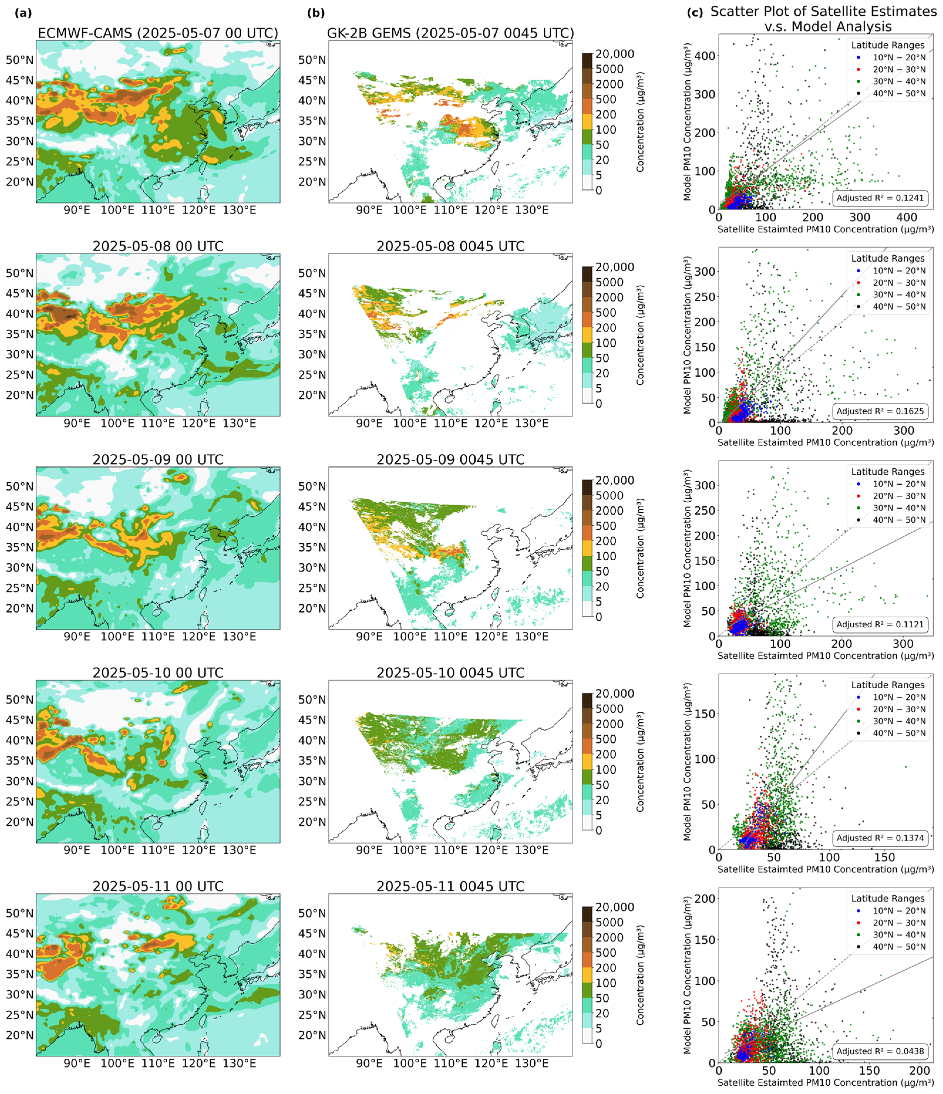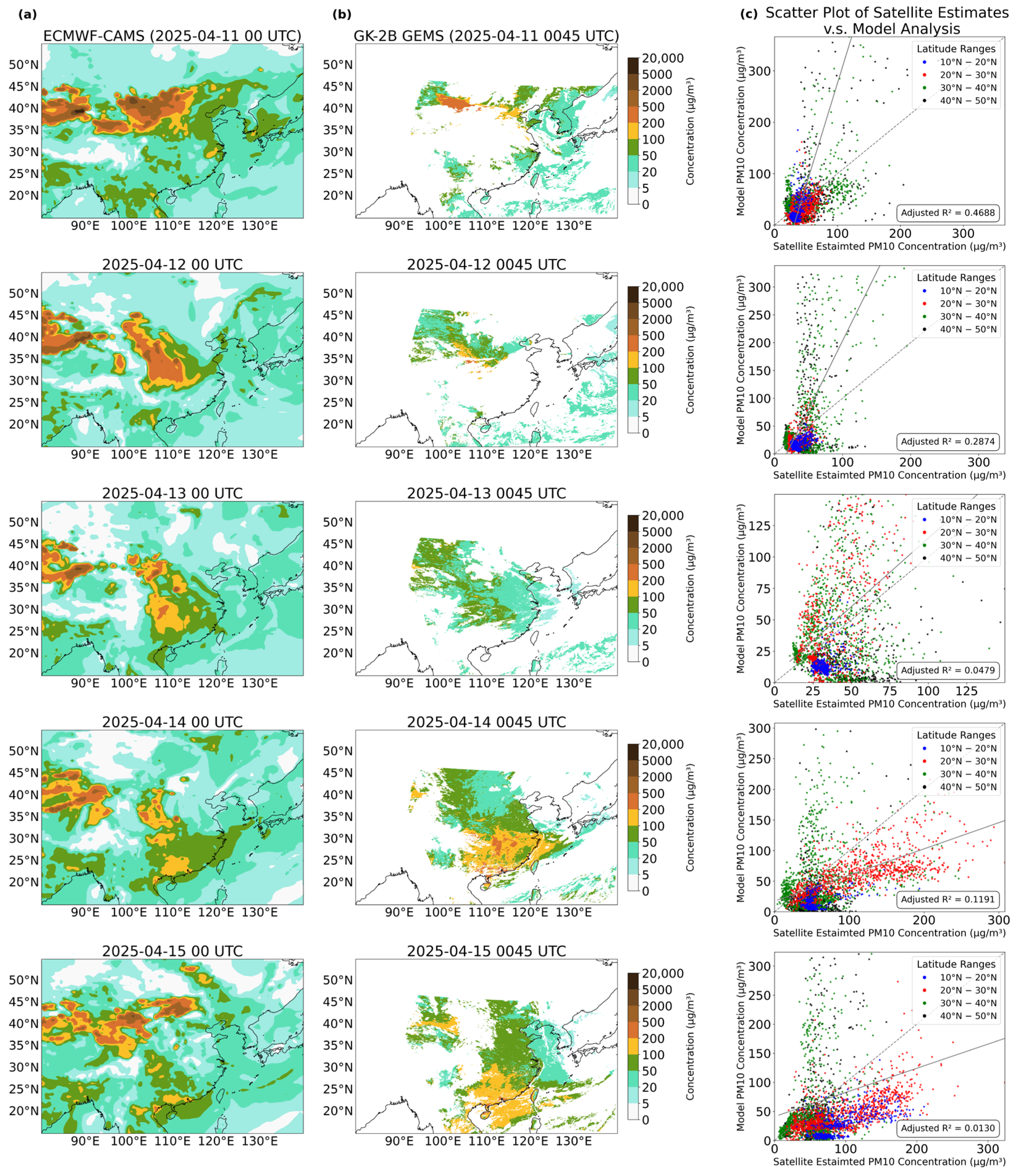 Comparison of PM10 concentration (µg/m3) between ECMWF-CAMS model analysis and GK2B-GEMS satellite estimates during the period of 11–15 April 2025. Column (a) shows the daily 00UTC 0.5-degree ECMWF-CAMS model analysis, while column (b) shows the GK2B-GEMS satellite estimated values at 0045UTC (refer to legend next to column (b) for the colour scale). Column (c) shows scatter plots of model-analysed PM10 concentration against the GK2B-GEMS estimates interpolated to a 0.5-degree grid with values at different latitude ranges indicated by different colours (refer to legend). The linear regression fit for all data pairs regardless of latitude range is indicated by the solid line with the proportion of variance explained (adjusted R-squared value) shown, while the dashed line is the identity line (y = x) for reference.