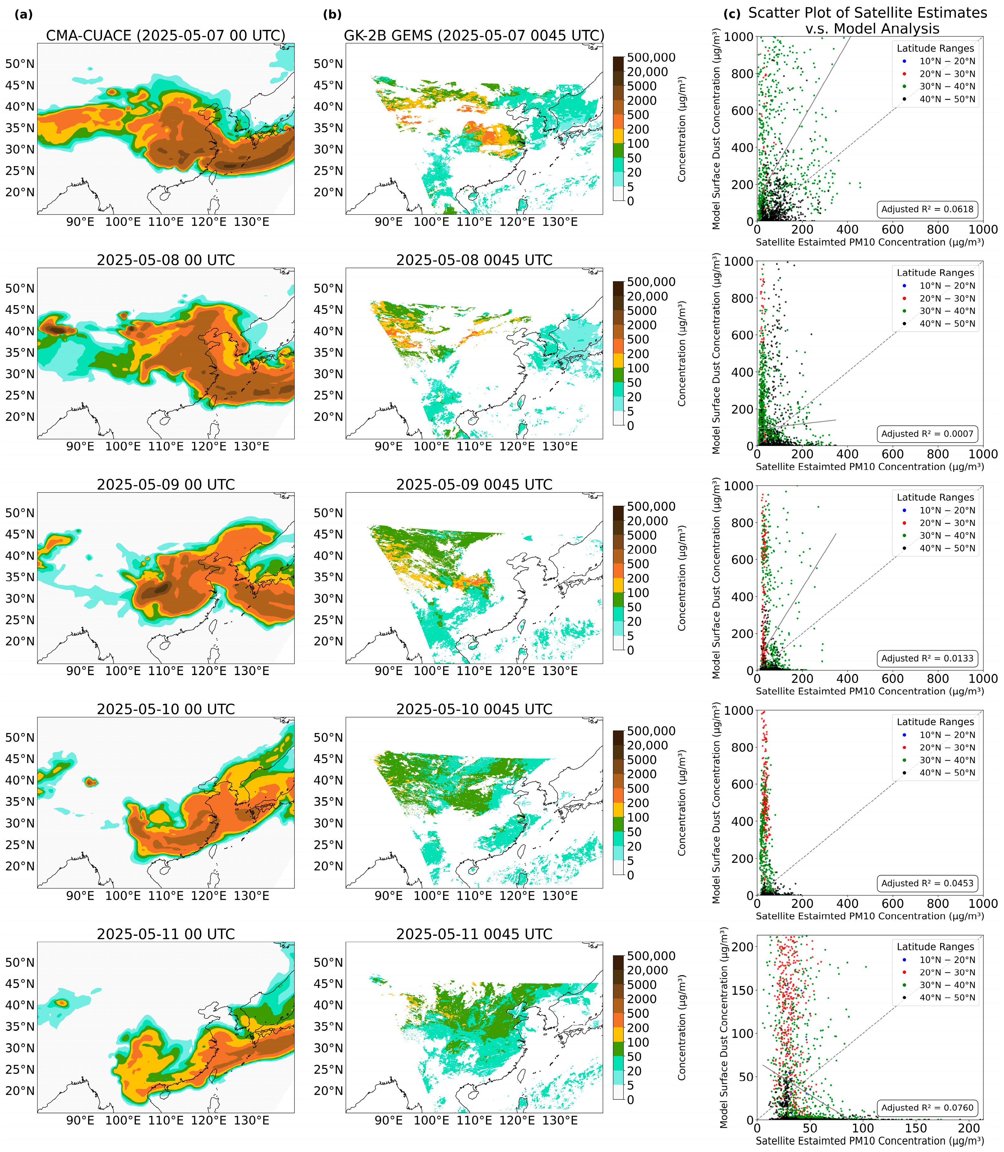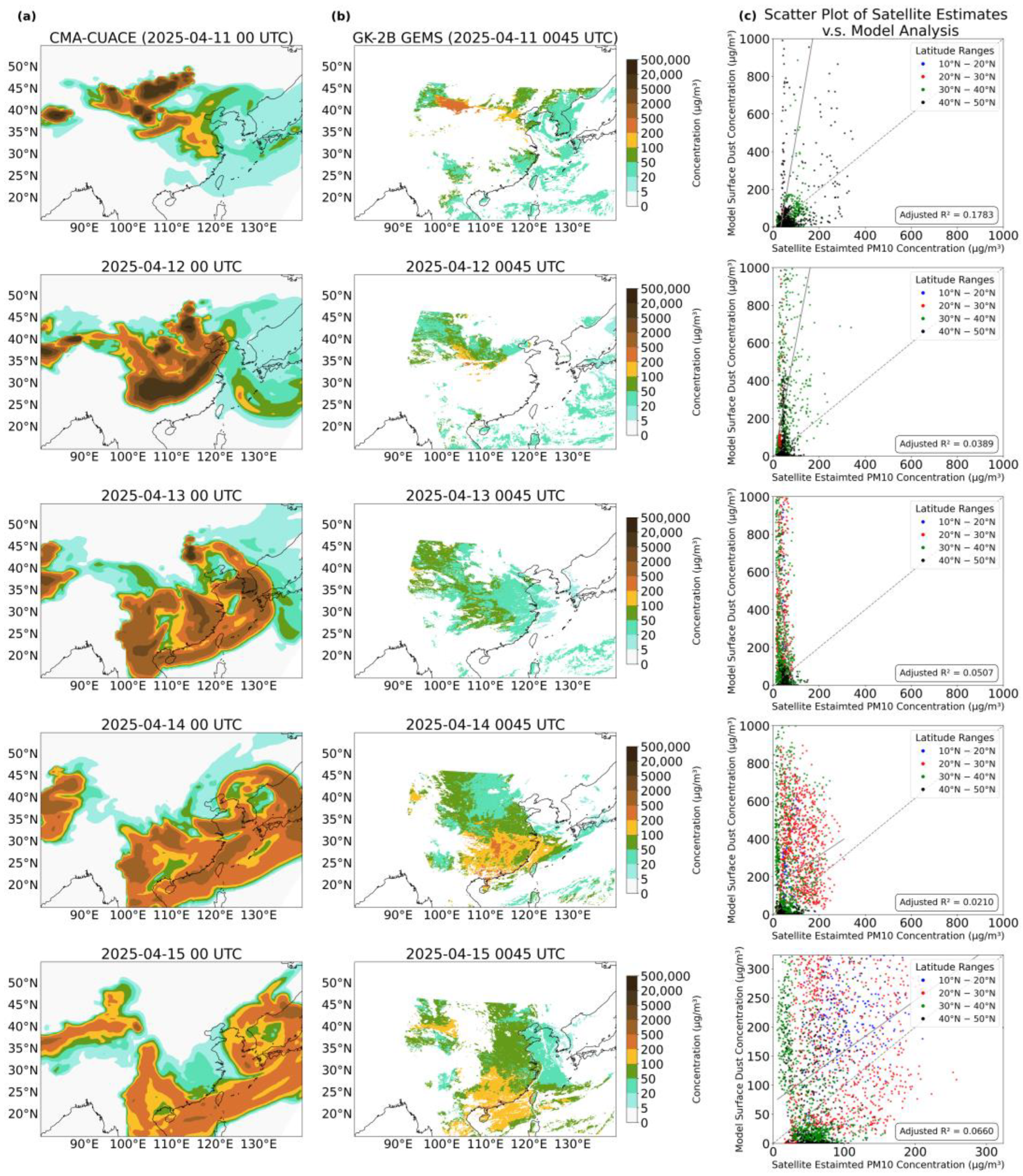 Comparison of CMA-CUACE model analysis of surface dust concentration (µg/m3) and GK2B-GEMS satellite estimates of PM10 concentration (µg/m3) during the period of 10–15 April 2025. Column (a) shows the daily 00UTC 0.5-degree CMA-CUACE model analysis, while column (b) shows the GK2B-GEMS satellite estimated values at 0045UTC (refer to legend next to column (b) for the colour scale). Column (c) shows scatter plots of model-analysed surface dust concentration against the GK2B-GEMS estimates of PM10 concentration interpolated to a 0.5-degree grid with values at different latitude ranges indicated by different colours (refer to legend). The linear regression fit for all data pairs regardless of latitude range is indicated by the solid line with the proportion of variance explained (adjusted R-squared value) shown, while the dashed line is the identity line (y = x) for reference. For the sake of clarity, large values of surface dust concentration are omitted.