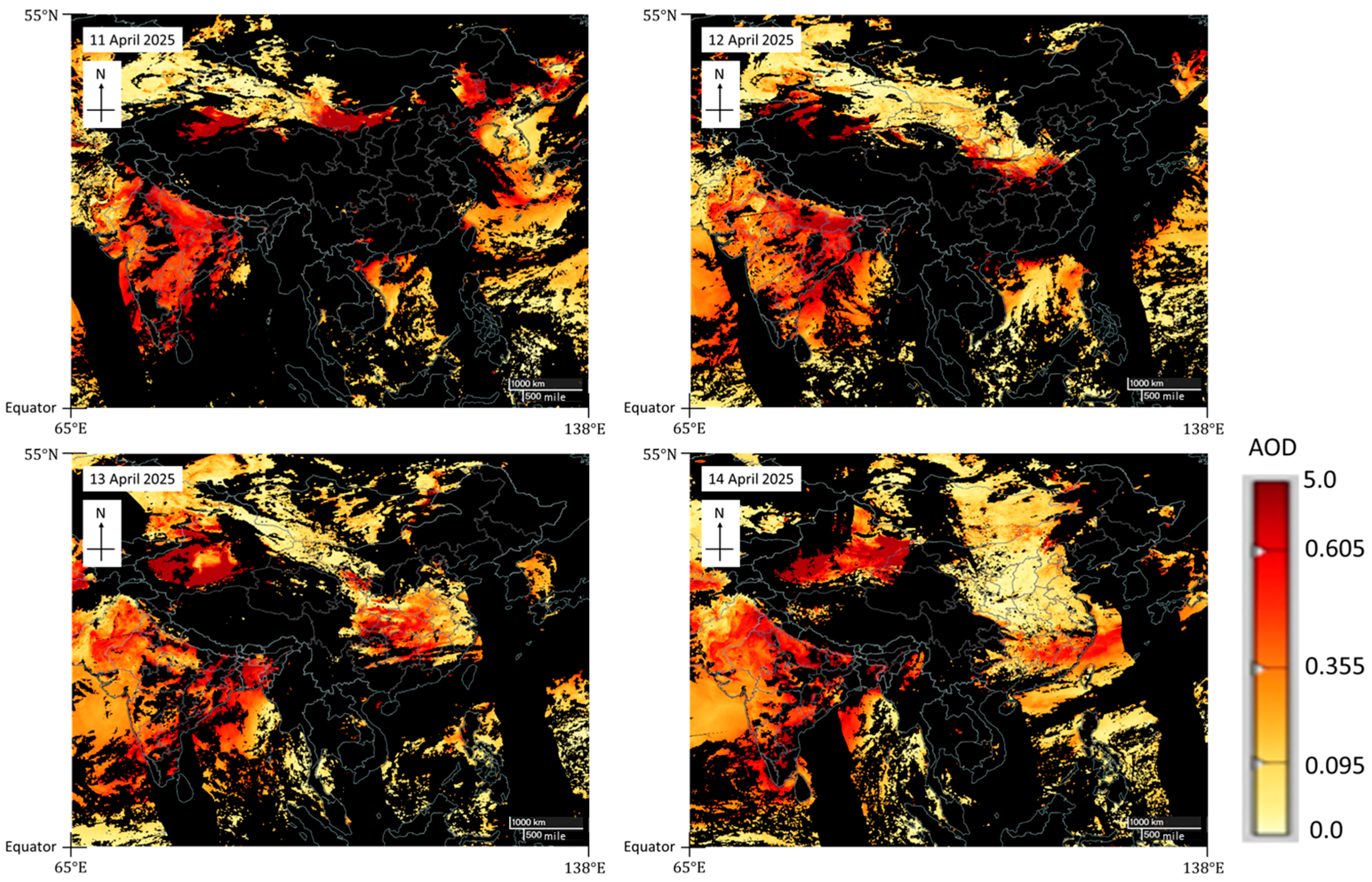 Figure 9. It is noted that a non-linear scale is adopted in such images. From 11–14 April 2025, the area with higher AOD spread southwards gradually, starting from Mongolia (11 April), to central China (13 April) and eventually reaching southern China (14 April). Unfortunately, during the propagation of sand/dust to the coast of southern China in 12–13 April, the region was cloudy so AOD data was not available. The trend of higher AOD movement is generally consistent with the ground-based reports [