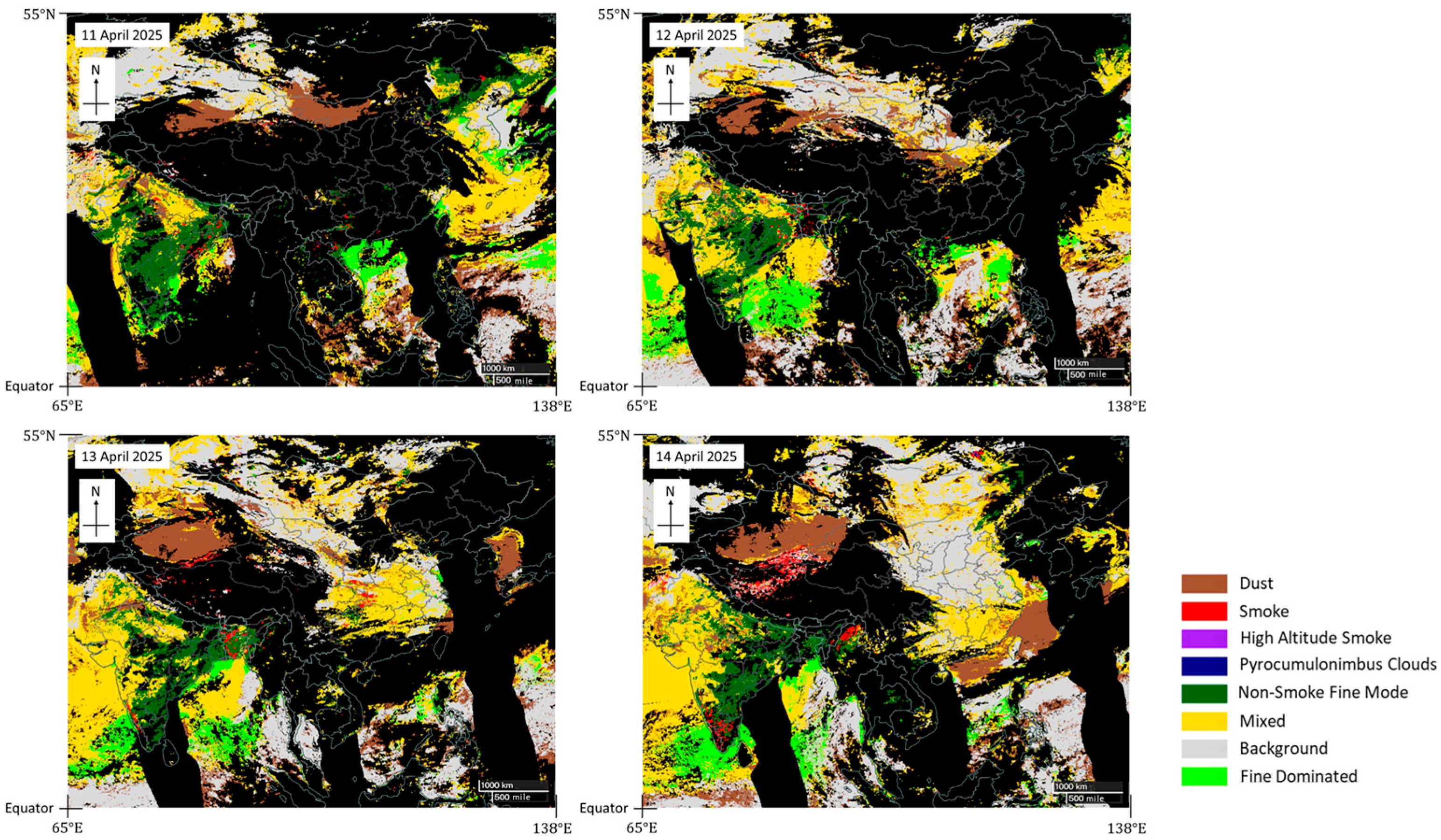 Aerosol classification from 11–14 April 2025 observed by NOAA-20 VIIRS. The type over the coastal region of southern China changed from fine particulate (green) to dust (brown) during the episode.