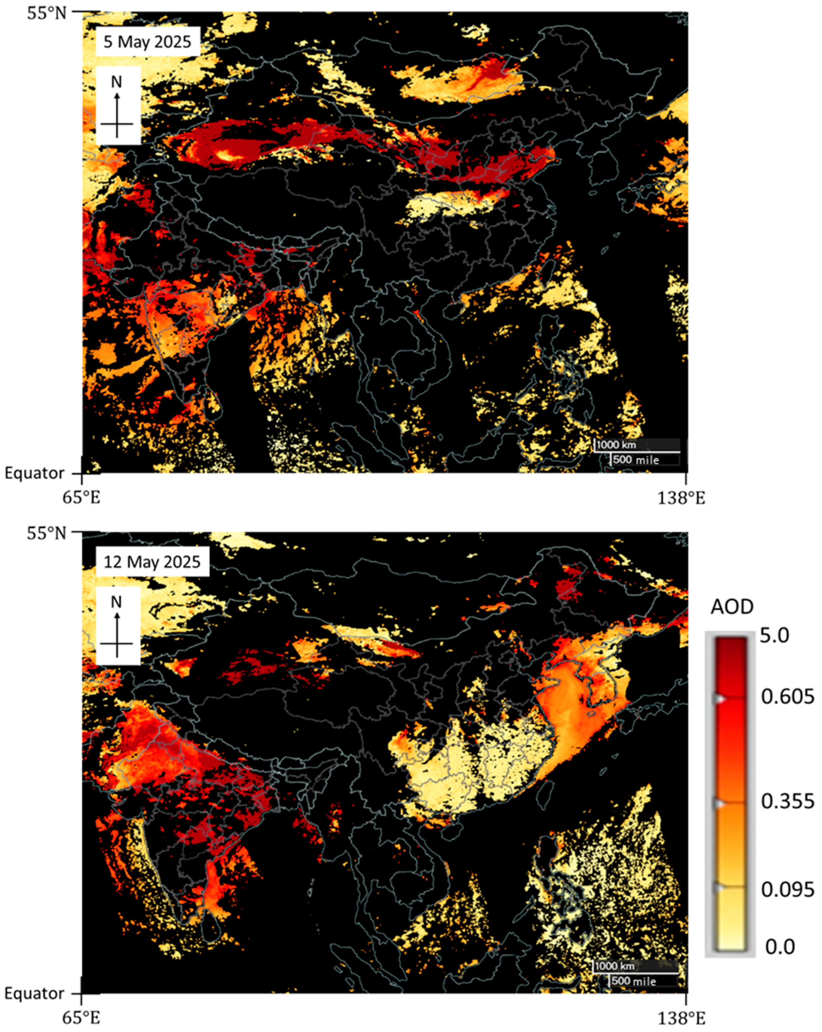 AOD at 550 nm on 5 and 12 May 2025 observed by NOAA-20 VIIRS. High AOD region was confined to northern China and did not affect southern China.