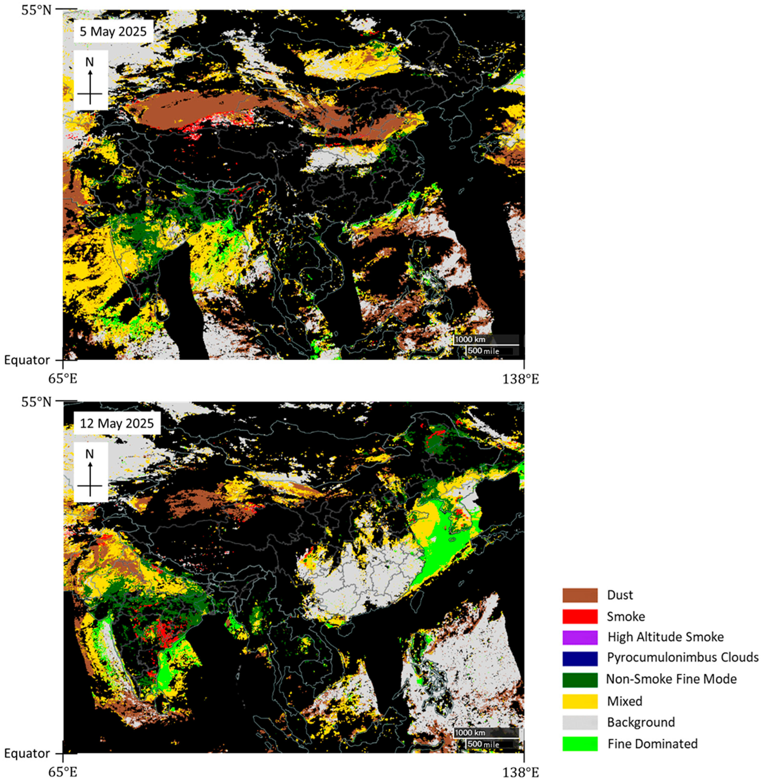 Aerosol classification on 5 and 12 May 2025 observed by NOAA-20 VIIRS. Dust (brown) was confined to northern China. The southern China is so clean that the aerosol was classified as background on 12 May 2025.
