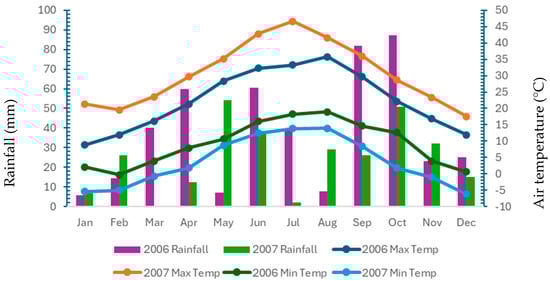 Field experiments were conducted over two consecutive growing seasons (2006 and 2007) at the experimental farm of Aristotle University of Thessaloniki [], located in Northern Greece (40°32′9.32″ N, 22°59′6.17″ E; 10 m above sea level). The site has a Mediterranean climate, characterized by hot, dry summers and mild, wet winters. Conducting the experiment over two natural years allowed us to capture the interannual climate variability typical of the Mediterranean region, which cannot be simulated reliably within a single season. Daily maximum and minimum temperatures, along with rainfall, were recorded throughout both seasons (Figure 1) to provide detailed climatic context. The soil at the site is a calcareous loam (Typic Xerorthent). Pre-sowing soil analyses of the 0–30 cm layer were conducted to characterize fertility. Soil properties measured were: