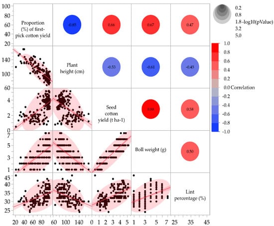 Trait correlations showed plant height negatively associated with other traits, whereas seed-cotton yield correlated strongly with boll weight and moderately with first-pick proportion and lint percentage [,,,,]. Excessive vegetative growth may divert resources from reproductive organs, affecting yield, although this effect can vary depending on genotype and environmental context [,], emphasizing the importance of managing vegetative vigor. Conversely, boll weight, lint percentage, and first-pick proportion consistently aligned with seed-cotton yield, supporting their use in selection and management.