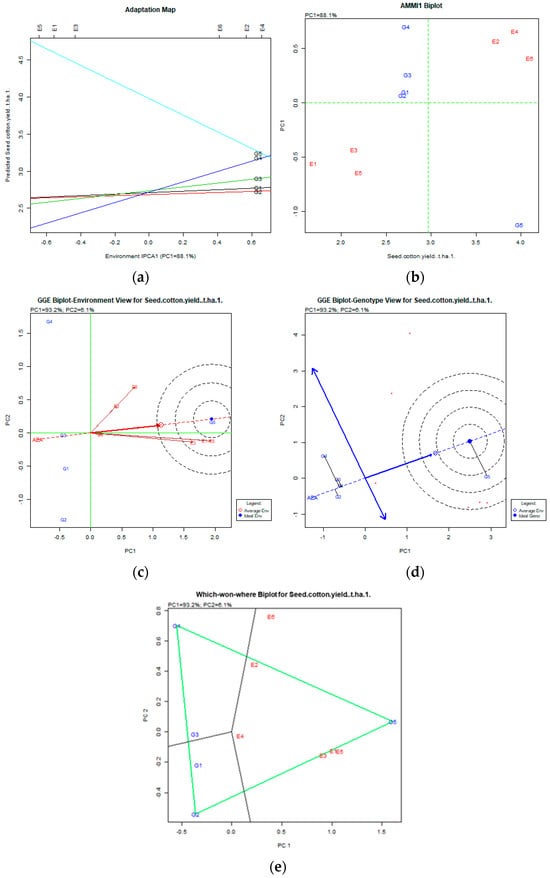 Stability analysis of seed-cotton yield (t ha−1) using multivariate methods: (a) AMMI adaptation map; (b) AMMI1 biplot; (c) environmental stability GGE biplot; (d) genotypic stability GGE biplot; and (e) “which-won-where” GGE biplot. Percent variance explained by PC1 and PC2 is indicated in each plot. Genotypes positioned near the ideal point represent high stability and superior agronomic performance.