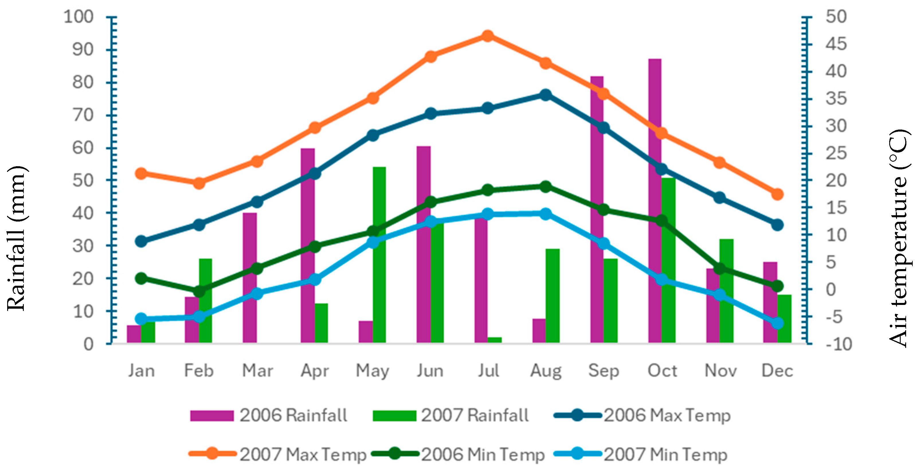 | Year | Total (Irrigation + Rainfall) (mm) | Rainfall (mm) | Irrigation (mm) | Irrigation Dates |
