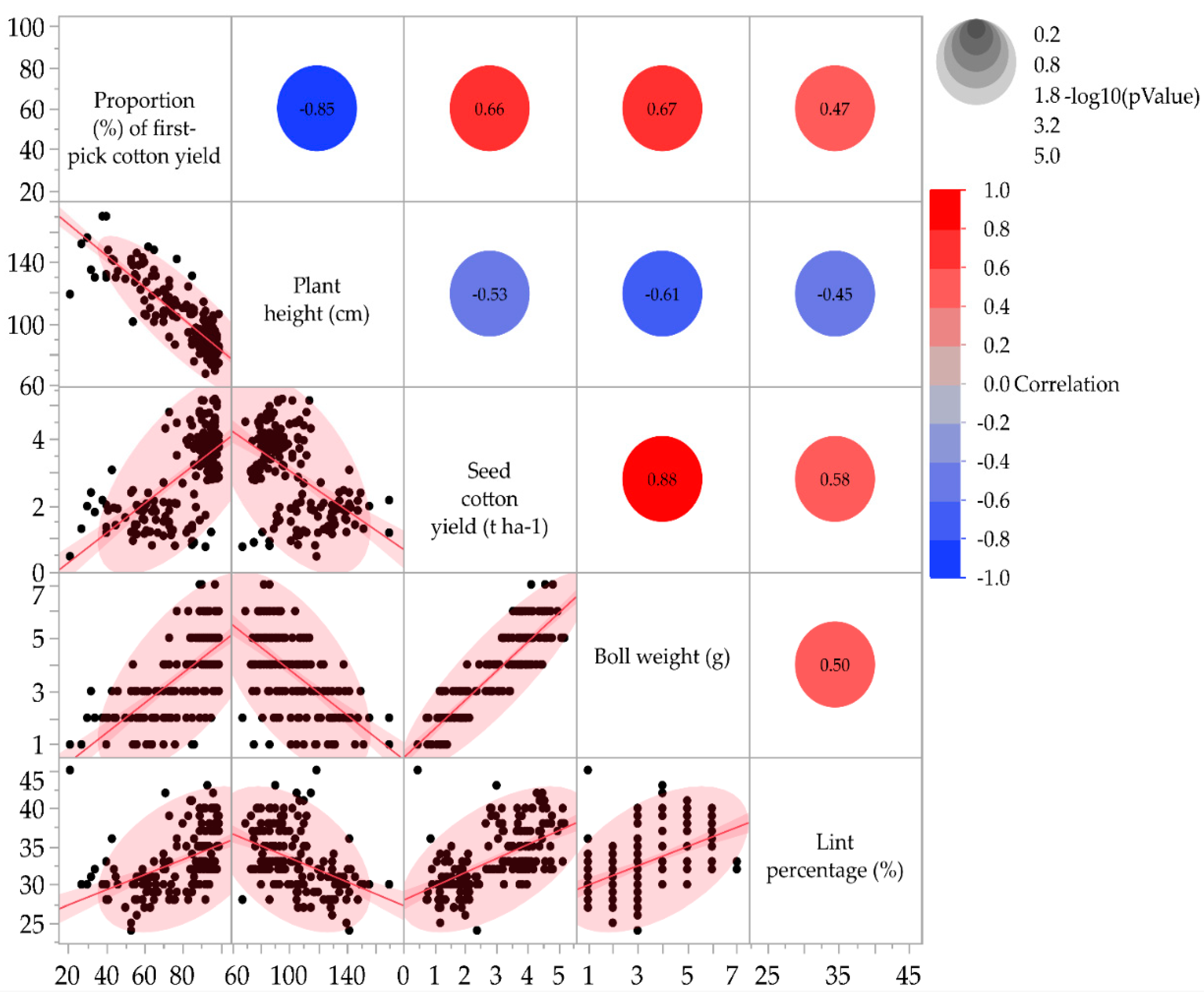 | Genotypes | Plant Height (cm) | Seed-Cotton Yield (t ha−1) | Proportion (%) of First-Pick Cotton Yield | Boll Weight (g) | Lint Percentage (%) |