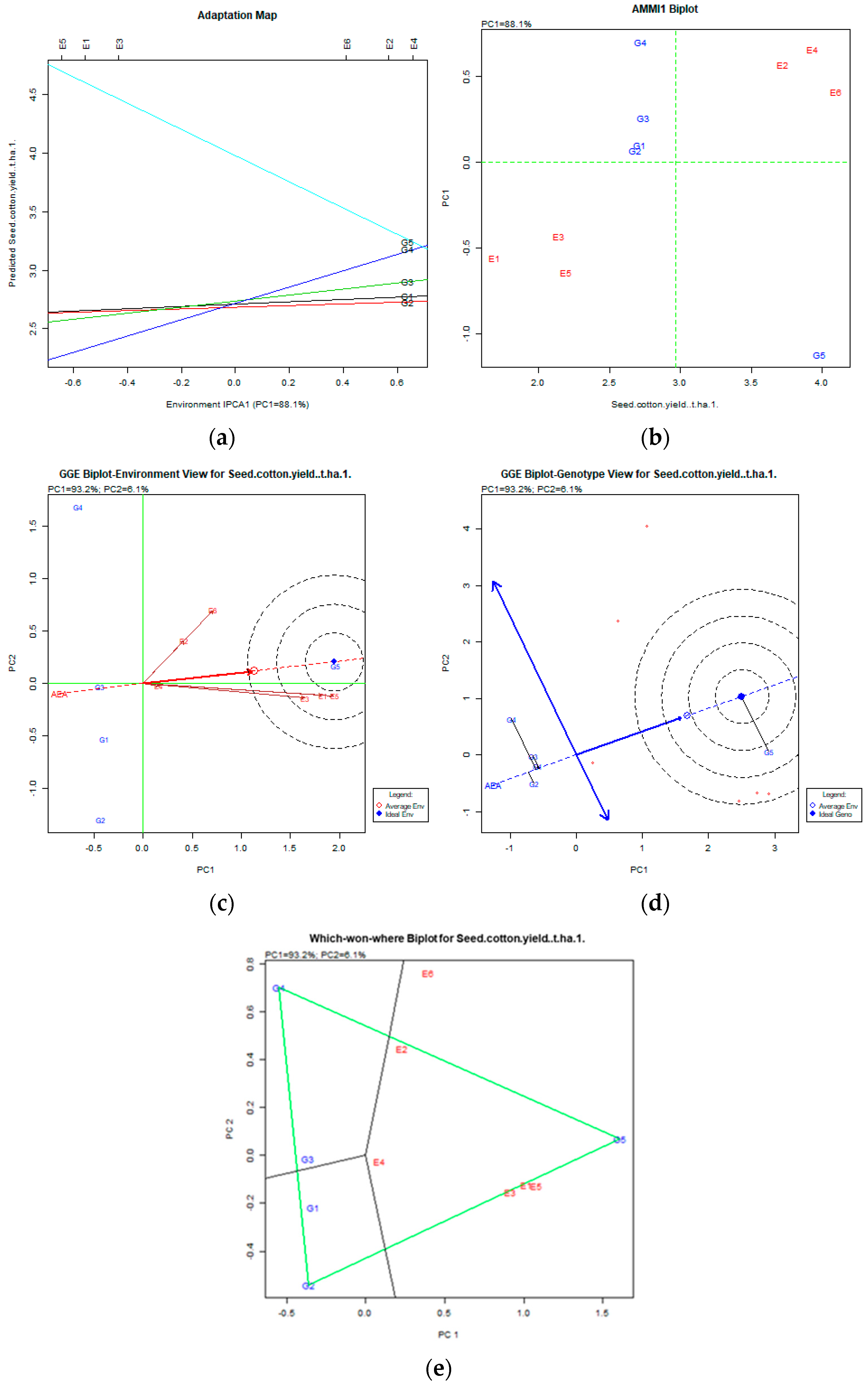 - Killi, F.; Harem, E. Genotype × environment interaction and stability analysis of cotton yield in Aegean region of Turkey. J. Environ. Biol. 2006, 37, 427–430. [Google Scholar]
