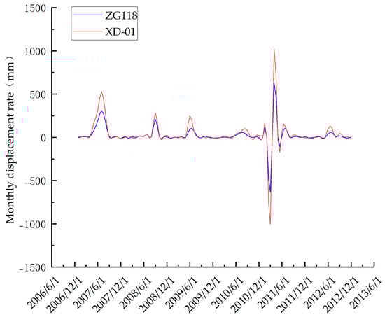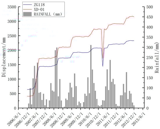 The cumulative landslide displacement and rainfall monitoring curves of the ZG118 and XD-1 monitoring points from December 2006 to December 2012 after data preprocessing are shown in Figure 8.