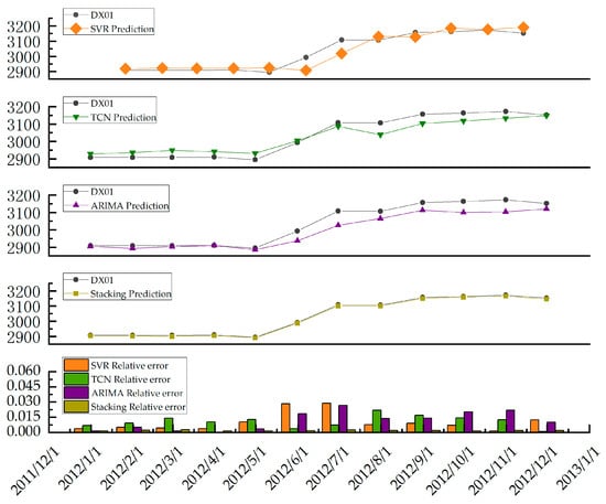 The stacking model is compared with the traditional SVR, TCN, and ARIMA models, and the results are shown in Table 4 and Figure 11.