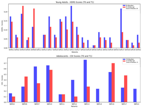 The clinical trial selection criteria were a score higher than 42 on the Post Intervention 25-item hikikomori scale (HQ-25), indicating a severe social isolation [5]. A total of 62 patients have been recruited thus far, and they provided informed consent to participate in the trial. Of these, 35 completed all eight CBT sessions and responded to both the pre- and post-treatment depression assessments ( and ), and they were therefore included in this study. This cohort consists of female and male participants and was divided into two groups as follows: 24 young adults and 11 adolescents, as shown in Figure 1 and Figure 2. The final sample included 276 h and 40 min of speech recordings, comprising 199,200 segments of 5 s. Patient-attributed speech accounted for of the total recorded audio ( h). Each segment represents a continuous chunk of speech extracted from speech session recordings. The 5 s duration was chosen to strike a balance between temporal resolution and feature stability. It is short enough to capture meaningful vocal cues yet long enough for reliable acoustic extraction. This approach is inspired by the thin slices theory [24], which posits that it is possible to assess psychological states, such as depression, through short audio segments. Future extensions will include robustness checks with alternative segment durations.