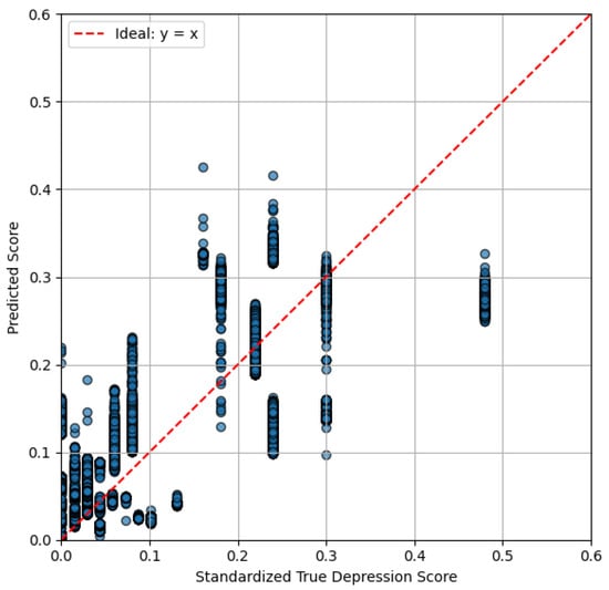 This performance is further illustrated in Figure 3, which shows the predicted versus true standardized depression scores using MLP with wav2vec 2.0 (R4). While some underestimation is observed at higher true scores, predictions generally follow the expected trend, indicating the model’s ability to capture individual variation in depressive severity.