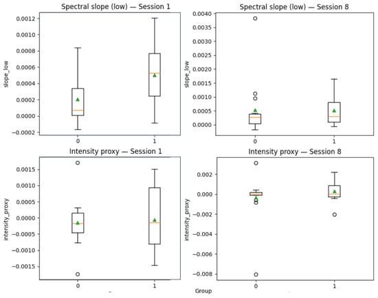 Changes in MFCC-derived intensity and spectral slopes from Session 1 to Session 8 in Worse (0) and Better (1) patient groups. Boxplots show medians (orange lines), means (green triangles), quartiles, and outliers (circles).