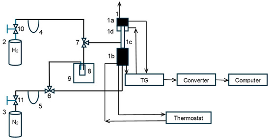 Schematic diagram of the test installation: 1—spring thermobalance, 1a—temperature measurement system, 1b—mass measurement system, 1c—quartz reactor, 1d—reactor furnace, 2—hydrogen cylinder, 3—nitrogen cylinder, 4, 5—flow meter, 6, 7—three-way valve, 8—scrubber, 9—cryostat, and 10, 11—pressure reducing valves.