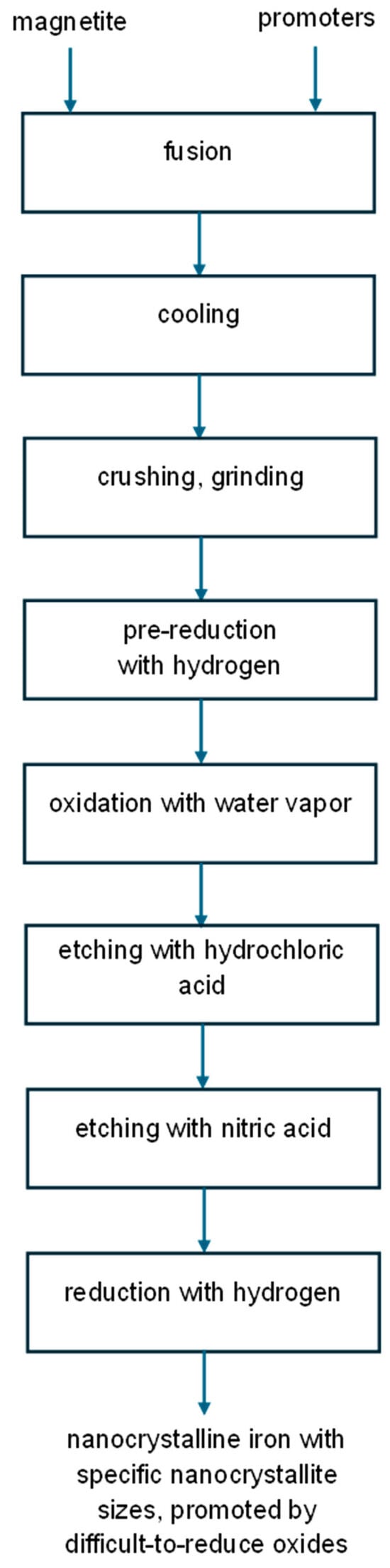In the second-generation method for fractionating nanocrystallites, as presented in [2], structure-forming promoters (Al2O3, CaO) were added at the first stage of synthesis, i.e., during the melting of magnetite with promoters (at a temperature of approximately 1600 °C). Although these additives are present in a small amount only (max. ca. several percent by weight), they ensure thermal stability to metallic iron nanocrystallites and develop their specific surface area [2,47]. Thus, due to this addition, the obtained metal–ceramic nanocomposites with specific metal nanocrystallite sizes were stable during further studies, even at temperatures exceeding 500 °C [47]. This method allows for the temperature range of research to be extended well beyond room temperature.
