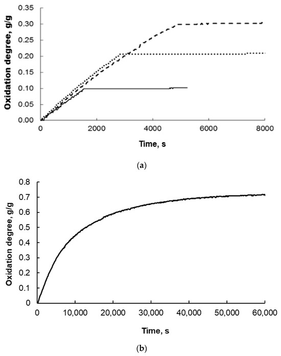 The oxidation was carried out very slowly at low concentrations of water vapor in nitrogen to avoid uncontrolled oxidation or even combustion and to drive the reaction within the kinetic range of the reaction. Therefore, the figures above show that this reaction took thousands of seconds in the oxidation degree range up to 0.4 (Figure 3a). For the samples oxidized to oxidation degree 0.7, this time was more than 10 times longer (Figure 3b). In each case, however, a gradual increase in the mass of the solid sample was observed, and the higher the degree of conversion, the larger the iron nanocrystallites underwent phase transformation to magnetite, in accordance with the reaction model in the adsorption region [43].