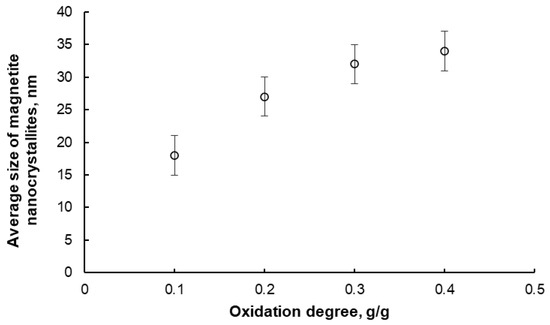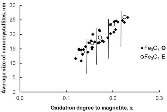 Average size of magnetite nanocrystallites in samples oxidized to different oxidation degrees at 425 °C and then selectively etched using the two-step method (error bars are also marked).