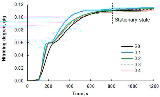 Results of thermogravimetric measurements of the nitriding process of nanocrystalline iron samples (100% ammonia at the reactor inlet; temperature of 375 °C), which were oxidized to oxidation degrees of 0.1, 0.2, 0.3, and 0.4 g/g before selective etching. For comparison, the results for the unmodified S0 sample are also presented. The dashed line indicates the beginning of the stationary region (constant mass of the solid sample).
