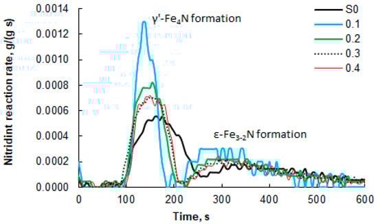 Differences were observed in the shapes of the TG curves obtained for the modified (etched) samples and the reference sample S0. The inflection on the TG line, indicating the moment of phase transformations from α-iron to γ’-Fe4N nitride and then to ε-Fe3-2N near the nitriding degree of 0.058 g of nitrogen/g of iron, is less clearly visible in the TG curve for the unmodified sample than for the modified samples. This is due to the relatively broad distribution of nanocrystallite sizes in the S0 sample. As a result, the phase transition boundary points become blurred, as nanocrystallites within a wide size range undergo phase transformation gradually over a relatively long time interval, typically on the order of several tens of seconds. The modified samples are characterized by a relatively narrow range of nanocrystallite sizes. In this case, almost all nanocrystallites undergo phase transformation at virtually the same time, i.e., within a few seconds. Phase transition boundary points in such samples are more clearly visible. These differences are even more pronounced when comparing the nitriding rates of the modified and reference samples.
