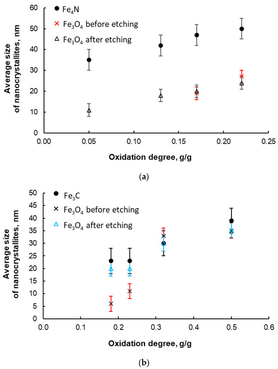 (a) Average size of γ’ iron nitride nanocrystallites; nitriding at 375 °C, nitriding potential P = 0.02 Pa−1/2; during preparation, the samples were oxidized to various oxidation degrees in the range of 0.05–0.22 g/g. For comparison, the average size of magnetite nanocrystallites before and after the stage of selective etching of metallic iron from oxidized samples is shown. (b) Average size of Fe3C iron carbide nanocrystallites; carburizing at 465 °C, ethene/hydrogen ratio = 0.1; during preparation, the samples were oxidized to various oxidation degrees in the range 0.18–0.50 g/g. For comparison, the average size of magnetite nanocrystallites before and after the selective etching stage of metallic iron from oxidized samples is shown (error bars are also marked).