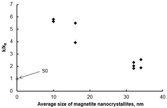 Dependence of the relative reaction rate constants of the catalytic ammonia decomposition of the modified samples relative to the rate constant of this reaction for the S0 sample (◆) on the average size of magnetite nanocrystallites remaining in the samples after the selective etching step. For comparison, the ammonia decomposition rate on the S0 sample is also shown.