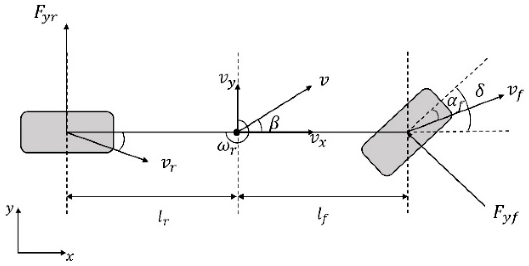 To analyze the vehicle’s lateral dynamics during trajectory tracking, this study utilizes the classical 2-DOF bicycle model. This model simplifies the vehicle by lumping the two front and two rear wheels into single front and rear wheels, respectively, as depicted in